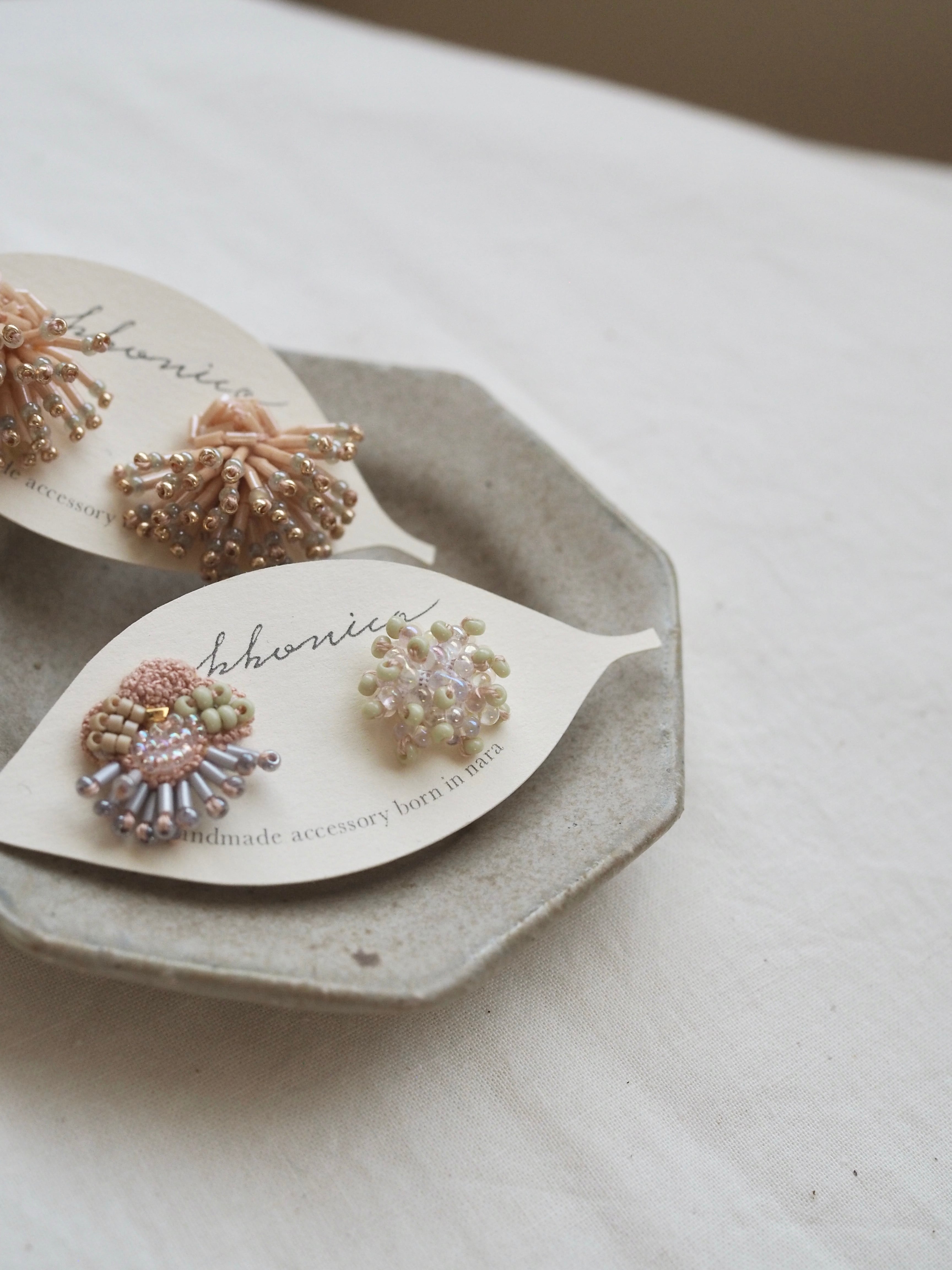 ひとつひとつ、その時々のインスピレーションで糸やビーズを選び刺繍していく一点物のアクセサリーとなっております。