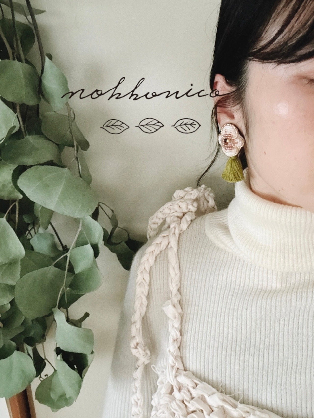 ◯ひと針ひと針、丁寧にビーズを通しておつくりしております。他のアクセサリーとは違った手づくりならではのあたたかみを感じて頂ければと思います☺︎